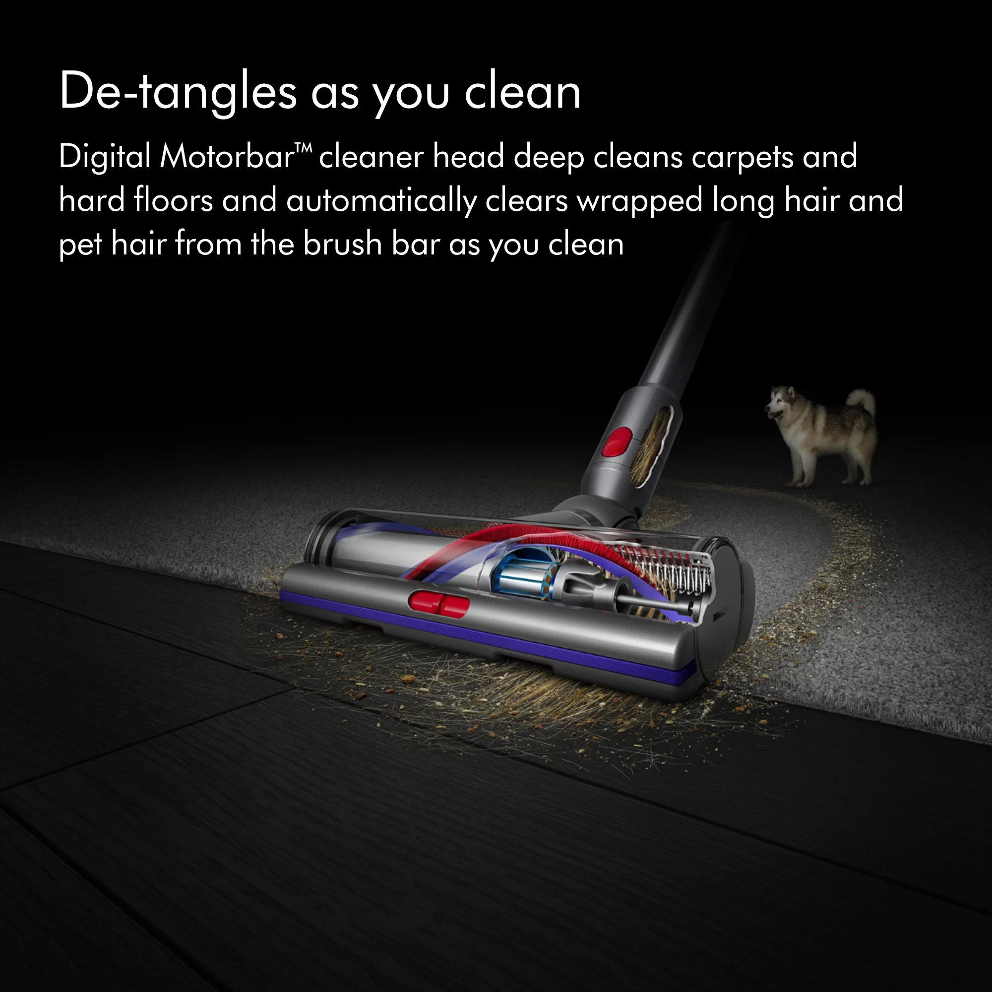 An integrated digital motor spins the brush bar up to 60 times a second. It drives stiff nylon bristles deep into carpet to remove dirt, and carbon fiber filaments capture fine dust on hard floors.