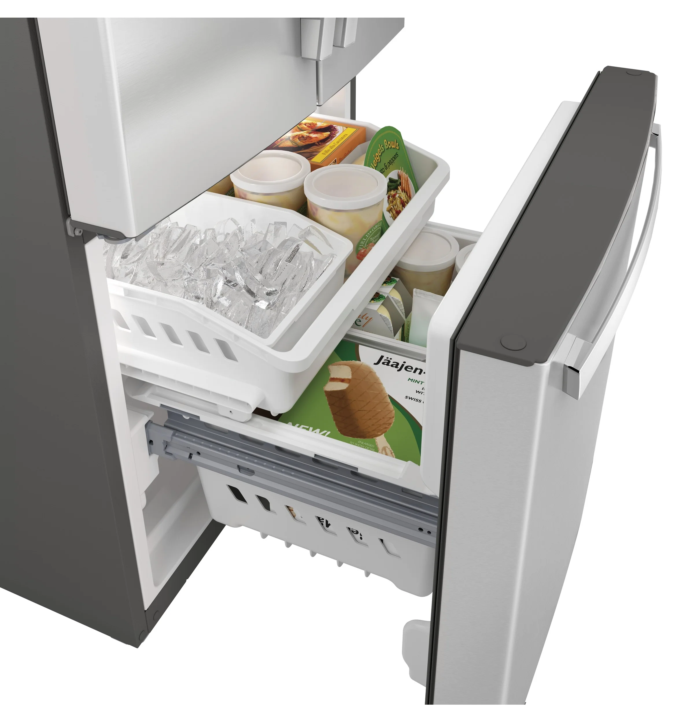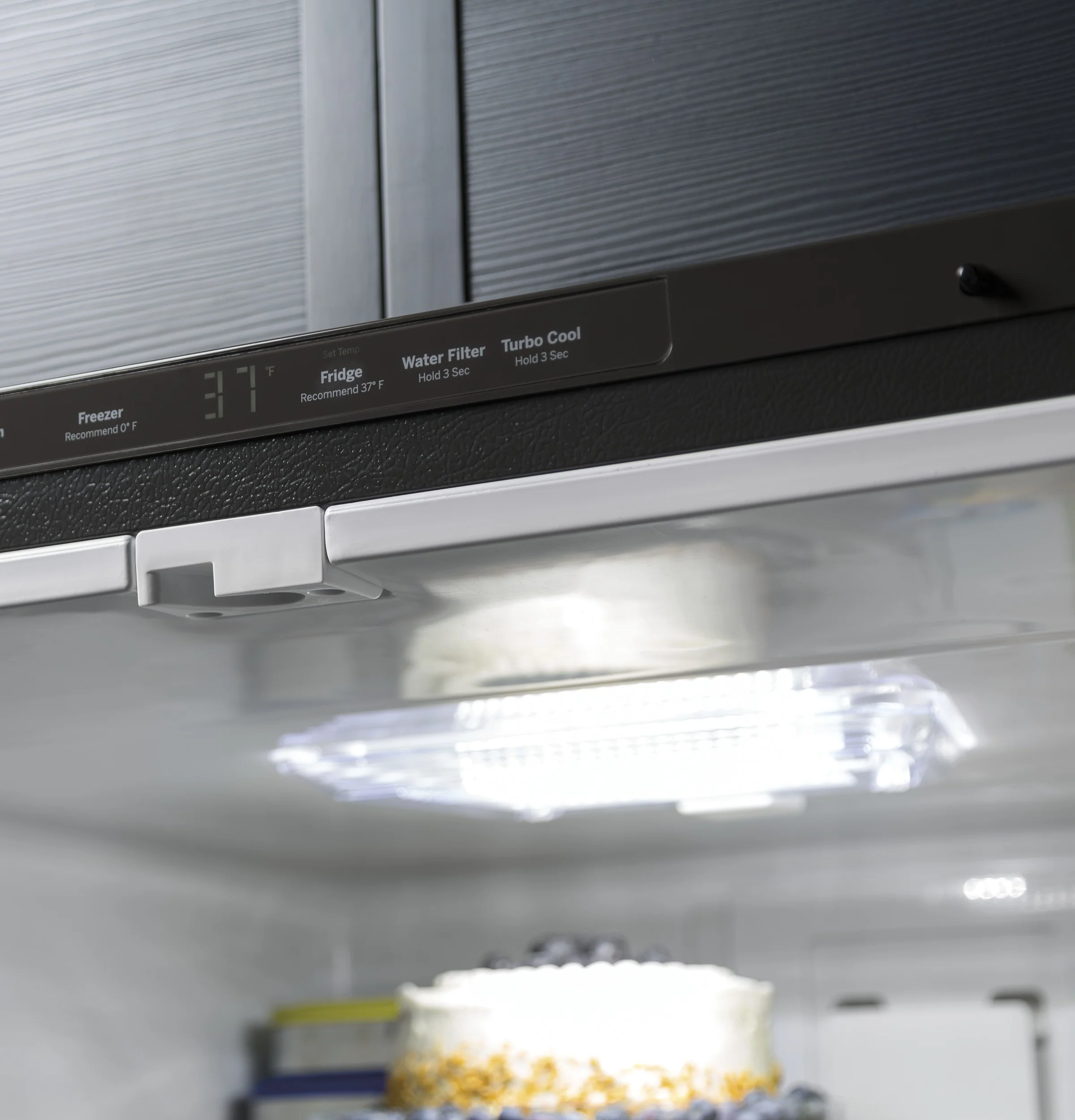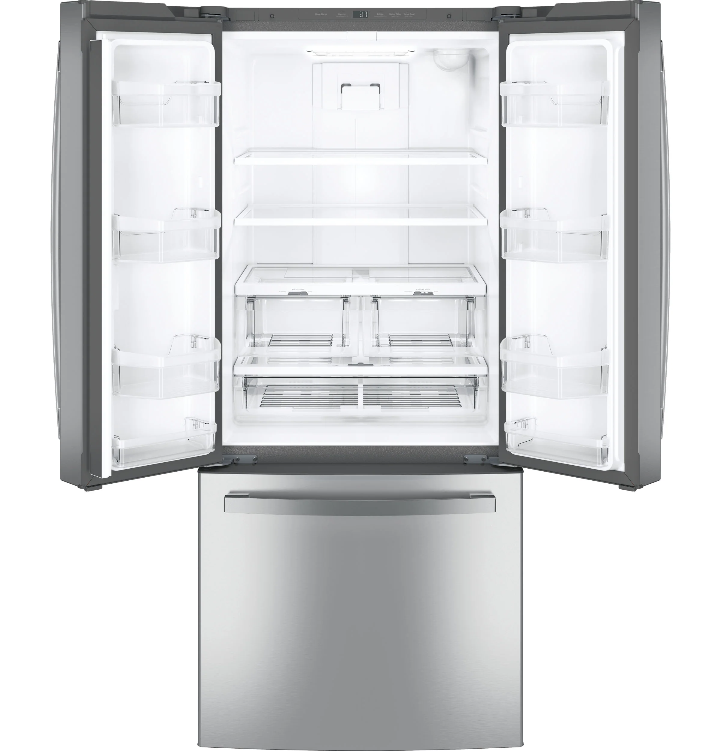 Temperature Management Features Multiflow Air System with Electronic Sensors, Turbo Cool setting Control Type Digital Temperature Display, Upfront Electronic Temperature Controls Icemaker Factory-Installed WiFi Connect Optional (Requires part no. PBX23W00Y0) Performance Features Easily Removable Door Gaskets Sabbath Mode Optional Filter Location Upper right corner Door Alarm Yes Freezer Storage Baskets 1 Full-Width, Full-Extension Plastic, 2 Total Freezer Cabinet Drawer Features Freezer Drawer Defrost Type Frost Guard Leveling System 2 Point Front Adjustable Fresh Food Cabinet Shelves 2 Adjustable, 2 Full-Width, 3 Total - Glass Fresh Food Door Bins 2 Fixed, 6 Adjustable with Gallon Storage, 8 Clear Look Freezer Features Ice Bucket, Interior Lighting - LED Exterior Style Free-Standing Configuration French Door Refrigerant Type R600a Door Liner HIPS Dispenser Non-Dispenser Fresh Food Features Fresh Food Cabinet Drawers 1 Full-Width, Adjustable Temperature Drawer, 2 Humidity Controlled Drawers, Multi-Level Drawers Water Filtration GE Water Filtration (XWFE Filter), Water Filter Indicator Light Product Type Bottom Freezer Refrigerator, French-Door Refrigerator OU Certified OU/CRC Enhanced Shabbos Mode, when used with Shabbos Keeper, sold separately APPEARANCE