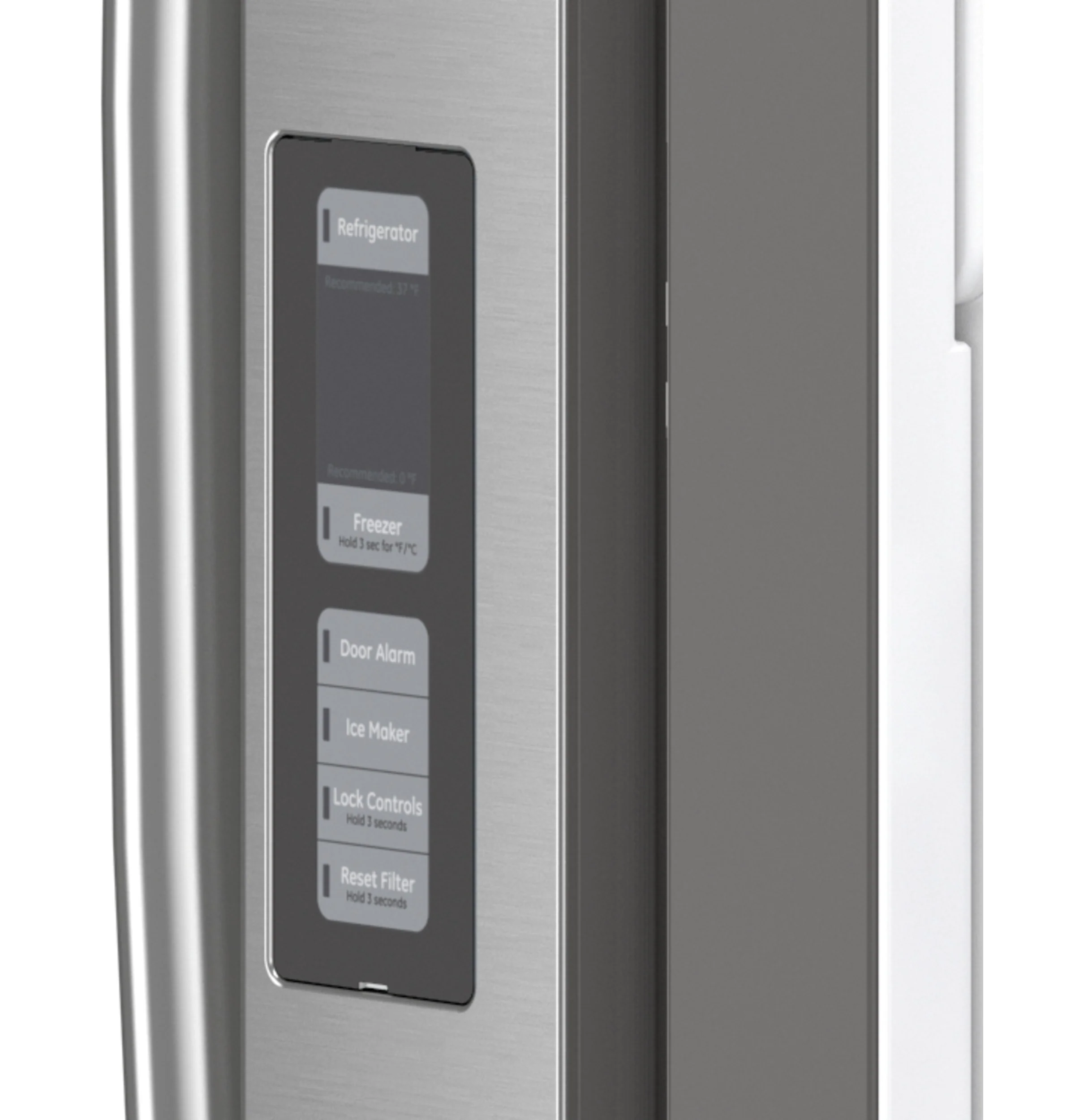 Control Type Internal Electronic Digital Temperature Display Icemaker Factory-Installed WiFi Connect Optional (Requires part no. PBX23W00Y0) Performance Features Easily Removable Door Gaskets Sabbath Mode Optional Filter Location Left wall Freezer Storage Baskets 2 Full-Width Temperature Management System TwinChill⢠Evaporators Defrost Type Frost Guard Leveling System 2 Front Leveling Legs Fresh Food Cabinet Shelves 4 Spill Proof, 4 Split Adjustable; 1 Full-Width, 5 Total - Glass Fresh Food Door Bins 4 Adjustable with Gallon Storage, 6 Total Freezer Features Interior Lighting - Showcase LED (2) Exterior Style Counter-Depth Configuration French Door Refrigerant Type R600a Dispenser Non-Dispenser Fresh Food Features Fresh Food Cabinet Drawers 1 Full-Width, 2 Adjustable Humidity, 3 Total Water Filtration Advanced Filtration System (RPWFE), Removes Pharmaceuticals Product Type Bottom Freezer Refrigerator, Counter Depth Refrigerator, French-Door Refrigerator OU Certified OU/CRC Enhanced Shabbos Mode, when used with Shabbos Keeper, sold separately APPEARANCE