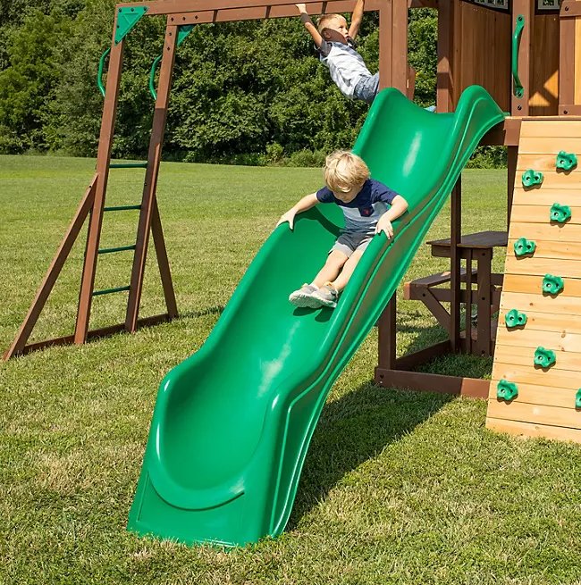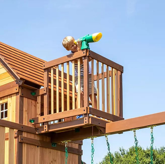 Kids will have access to two slides, three swings, a climbing wall, and an indoor play area with a grilling alcove, kitchen, chalkboard, dinner bell and so much more. After playing on the swings and slides, they can enjoy more activities in the kitchen area. The stove features battery-powered appliances for cooking fun.