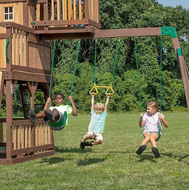 Bring home the fun of a park or playground with the Backyard Discovery™ Bristol Point Cedar Swing Set/Playset. Brimming with entertainment, from winding slides to an indoor playhouse, this wooden swing set has it all. Get your kids outside and give them a day in the sun with the rocking climbing wall, tube slide, wave slide, and trapeze swing as they stay active and engaged.