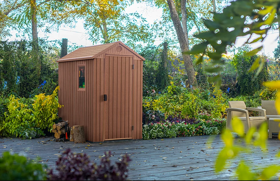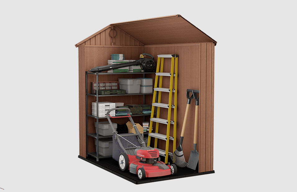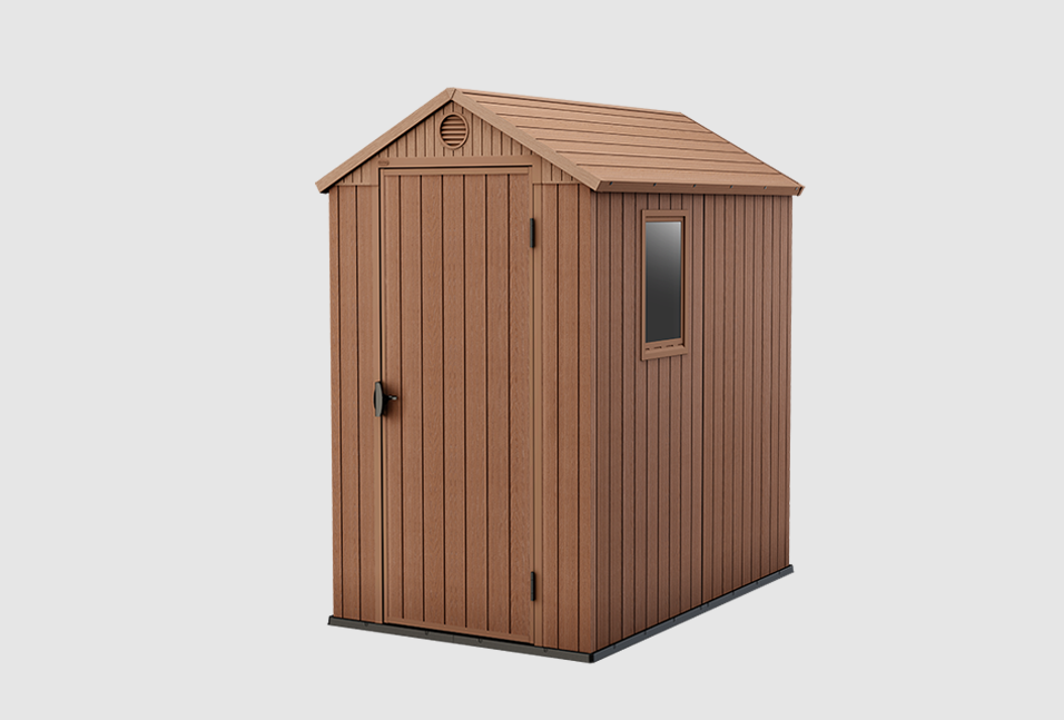It looks and feels like real wood, but it performs like nothing else. Thanks to our Evotech composite technology, requires zero maintenance - it will not rust, peel, or rot. Its special compact packaging means you can take it home in your car - no delivery required. Tongue and groove construction make assembly easy and fast, without the need for any special tools. This means that in an hour or two you'll have a strong, durable, great-looking shed that'll last you for years to come. Features and Benefits Ideal outdoor storage solution for all garden tools and equipment, BBQ's, bicycles and DIY tools Elegant natural wood look design with single door, built in ventilation and window for natural light Heavy duty floor panel with tongue and groove panels for easy assembly and lock hasp for additional security Made of durable, low maintenance and fade-free resin with double wall construction Assembled external dimensions: 125.8 x 184.5 x 205.1 cm (L x W x H); internal dimensions: 112 x 176.5 x 199.8 cm (L x W x H)