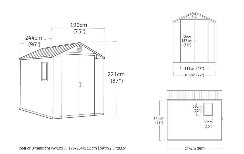 - Assembled external dimensions: 190 x 243.8 x 221 cm (L x W x H); internal dimensions: 176 x 235.5 x 214 cm (L x W x H)