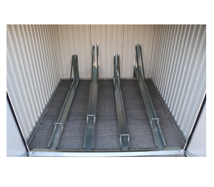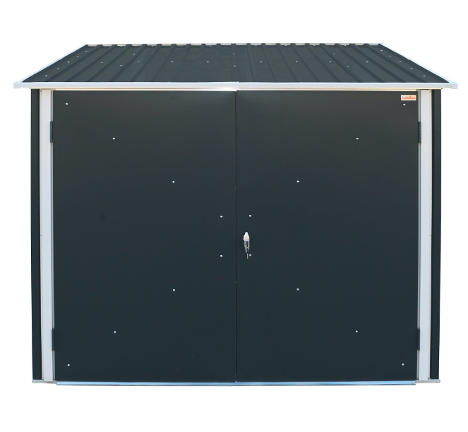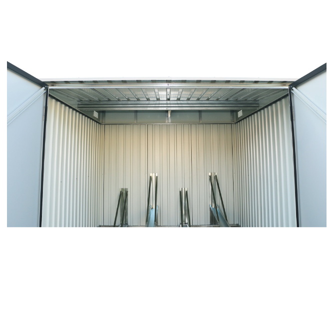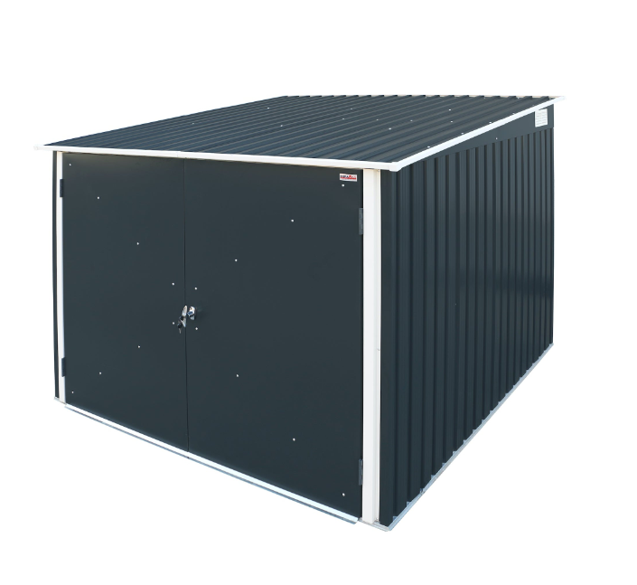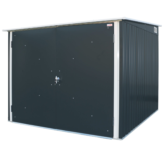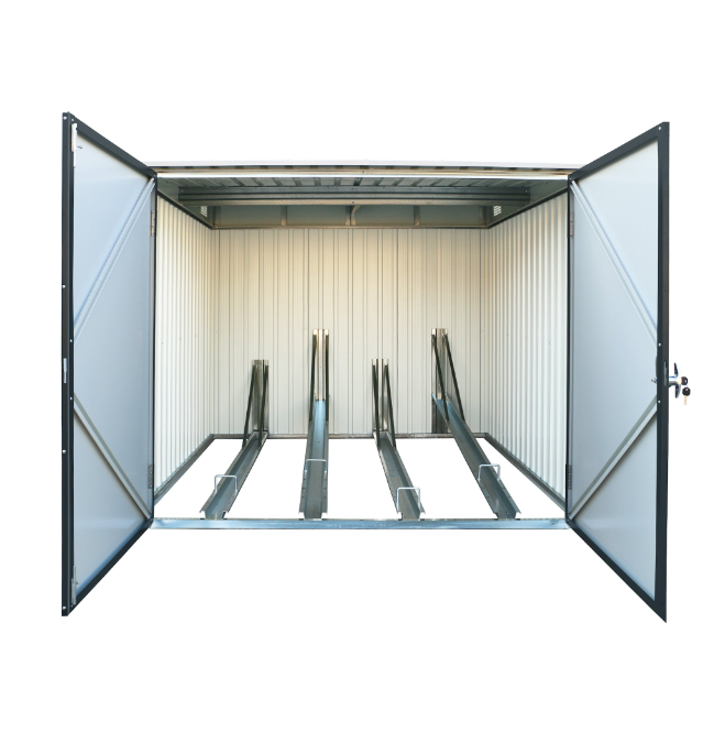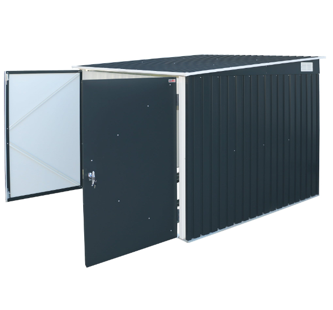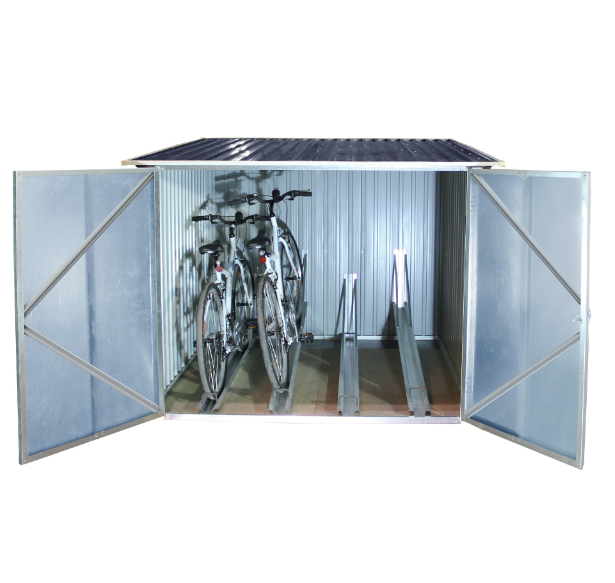 The bike store is an all metal bicycle shed, providing secure outdoor storage of up to 4 adult bicycles and cycling equipment. It is made from metal offering excellent security for storing all your mountain bikes, road bikes and general cycling equipment. Built from our thick, galvanized (weather proof) steel panels with metal parking tracks for bicycles; flooring not included. The bike tracks are adjustable to fit any bike, and can be removed for storing larger items. Convenient large double door access with key lock included. The reinforced roof and cross metal bars on each door add strength and security for your peace of mind. This can also be use for motorcycle storage as well! 12 Year Limited Warranty.