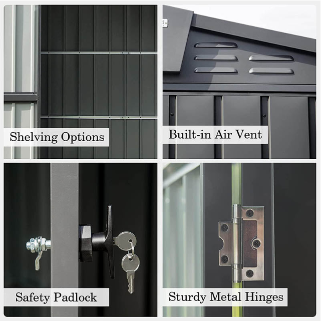 The outdoor storage shed with support bars as stable and durable construction. The roof adopts groove and slop design that allows rain to flow down quickly and avoid water builds up, protecting your stuff in thunderstorm weather.Pad-lockable doors give easy access to your stored items and enhance the safety.